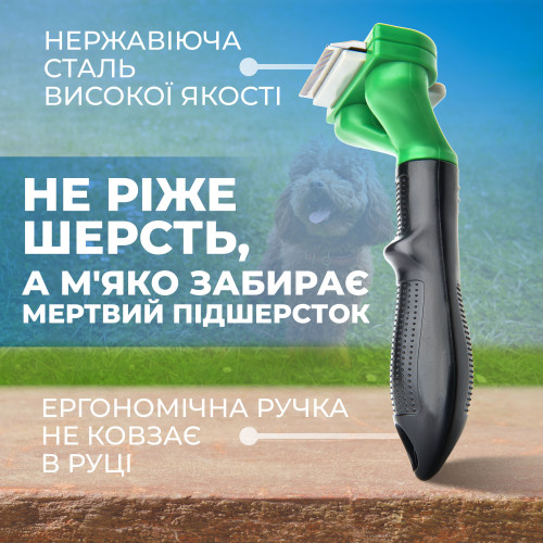 Благодаря особому строению зубцов, щётка проникает глубоко в шерсть, не повреждая кожу, и вычесывая на 90% больше подшерстка.