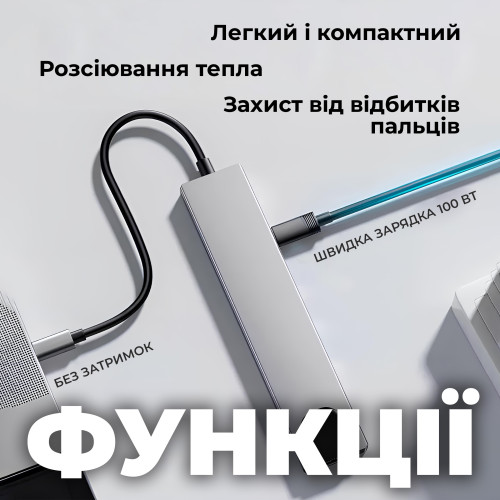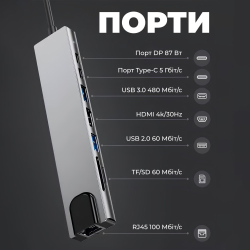 USB-C Hub оснащен всеми необходимыми функциями для повседневной жизни и работы, в том числе: 1 порт HDMI 4K при 30 Гц, 1 порт PD 87 Вт, 1 порт USB 3.0, 1 тип -C порт, 1 порт USB 2.0, 2 слота для карт SD и TF, 1x 100 Мбит/с RJ45.