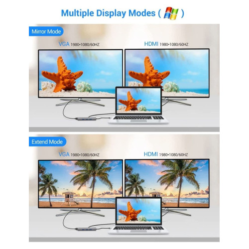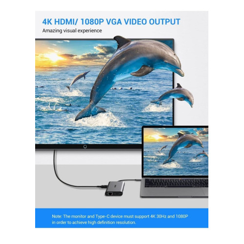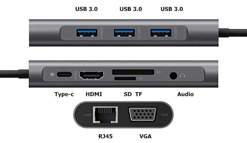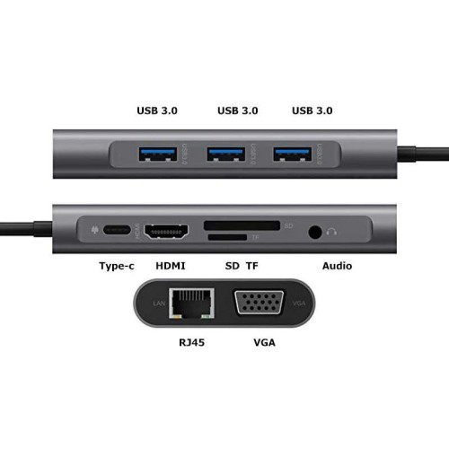 Уникальный адаптер USB-C на HDMI + VGA + AUX 3.5 mm SD/TF Card Reader + USB Hub 3x3.0+Lan+Type-C для Macbook и ноутбуков с интерфейсом USB Type-C объединяет в себе все актуальные, современные порты ввода-вывода информации: