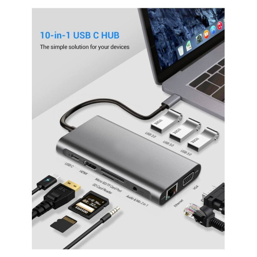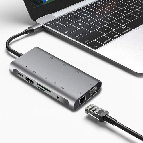 Адаптер Type-C 10 в 1 USB-C на HDMI + VGA + AUX 3.5 mm SD/TF Card Reader + USB Hub 3x3.0+Lan+Type-C для Macbook