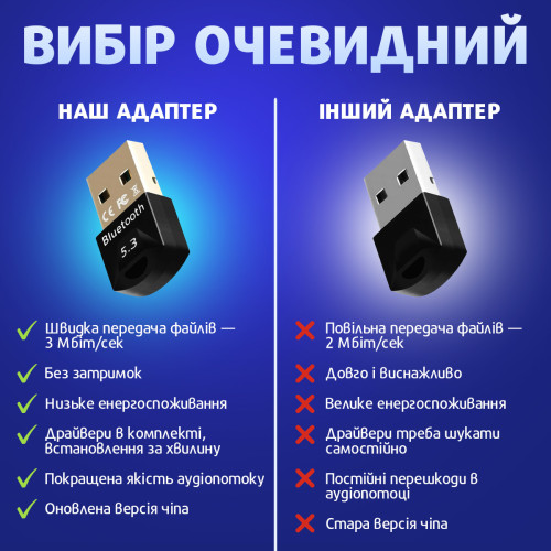 USB-адаптер Bluetooth версии 5.3 работает быстрее и стабильнее.