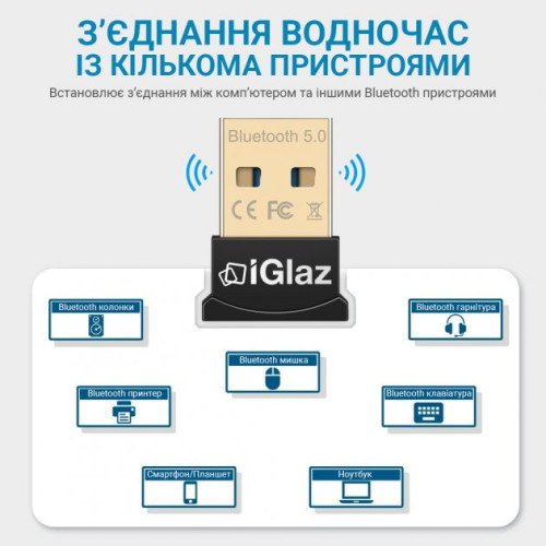 Bluetooth адаптер для ПК, Ноутбук Kayfovo iGlaz USB Bluetooth 5.0 BLE Win 7, 8, 8.1, 10, 11 Black (KLL-11) - Поддерживает 32/64 bit Windows 11/10/8.1/8/7 и обеспечивает беспроводное с с широким спектром устройств, таких как компьютеры, принтеры, телефоны, гарнитуры, динамики, клавиатуры, контроллеры и многое другое.