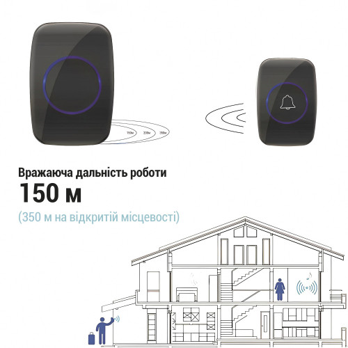 Большая дальность — до 350 м на открытом воздухе от передатчика (до 150 м при наличии стен). Если вы заняты в спальне или на кухне, наш беспроводной дверной звонок напомнит вам, что кто-то звонит снаружи. Никогда не беспокойтесь о пропавших посетителях.