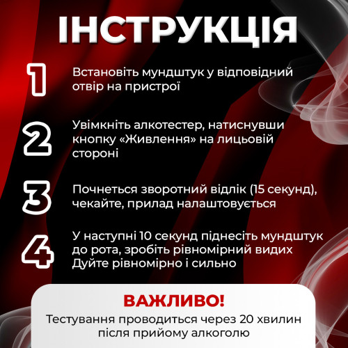- Между курением и измерением должно пройти не менее чем 15-20 минут (в противном случае измерительный тракт алкотестера быстро загрязняется).