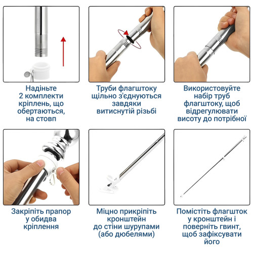 Флагшток держатель для флага телескопический регулируемый из нержавеющей стали + держатели клипсы для флага Kayfovo FD-1