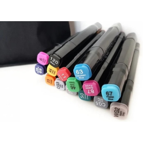 Маркеры для рисования и скетчей в черном тканевом футляре. Двусторонние, на спиртовой основе.