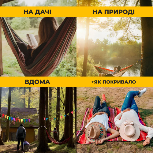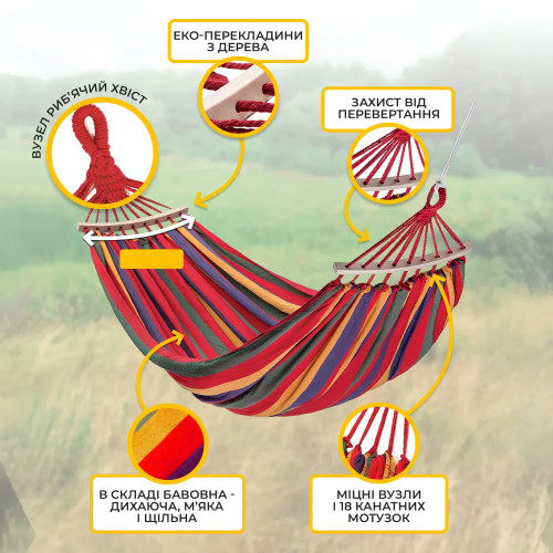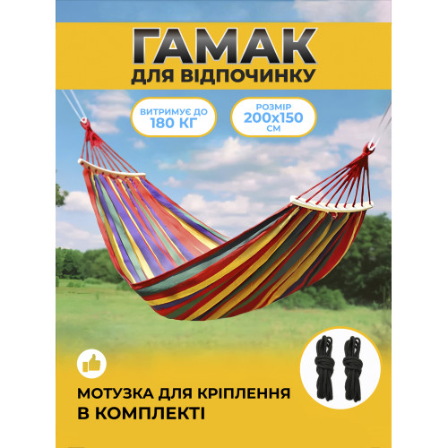 Изготовлен гамак из прочной хлопковой ткани (натуральная ткань с хорошей циркуляцией воздуха), имеет очень яркий полосатый окрас. При окрашивании используются нетоксичные натуральные красители, которые не линяют и не вызывают раздражений на коже. Да и лежать, покачиваясь намного комфортней после трудных будней, мысли о работе испаряются сами собой. Размер со шнурками: 200х150 см.