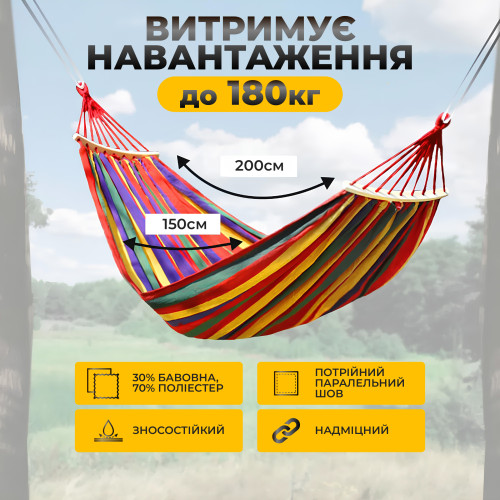 Гамак подвесной двухместный мексиканский с планкой прочной основой из толстой полосатой ткани с креплениями для детей и взрослых 200х150 см Kayfovo HR1