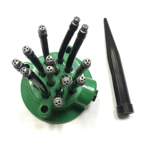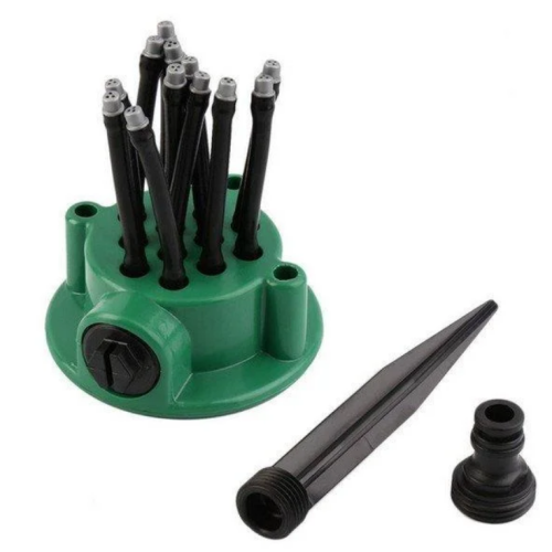 Автоматическая система полива оснащена 12 насадками, которые легко регулируются и устанавливаться в нужном направлении. Каждая мини-насадка оснащена распылителем, благодаря этому создается эффект дождя, а на растение не оказывается давление потоком воды, который может повредить корни, размывать почву. Распылитель легко разместить на любой поверхности. Благодаря этому устройству вы сможете орошать одновременно 35 кв.м. участка земли.